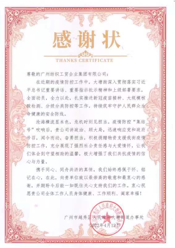 當(dāng)前,廣州疫情趨緊,4月12日,紡織公司黨委書記、董事長(zhǎng)簡(jiǎn)瑋儀,黨委副書記、紀(jì)委書記、工會(huì)主席丘海瀾親自帶隊(duì),把1500盒利工民毛巾送到了越秀區(qū)大塘街道。